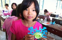 活動現(xiàn)場,孩子們盡情發(fā)揮自己的想象,用有限的廢紙、易拉罐等廢棄材料創(chuàng)造出了各種富有特色的手工藝作品。許多學生的創(chuàng)意作品超出了隊員們的想象,隊員們?nèi)滩蛔∨氖纸泻。雷州市烏石?zhèn)三教小學六年級學生用日常可見的易拉罐瓶設計出簡易的小垃圾桶。將平凡的垃圾桶擬人化,還在設計出來的垃圾桶上寫著“保護環(huán)境、愛護家園”等標語。二年級學生設計出的綠色太陽花,說那是一朵綠花,那是一個希望。