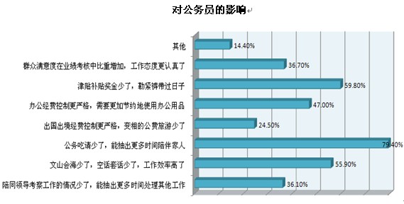“八項規(guī)定”的執(zhí)行給公務員帶來的最大影響是什么?本次調(diào)查中,排名前三位的影響依次是“公務吃請少了,能抽出更多時間陪伴家人”(79.4%)、“津貼補貼獎金少了,勒緊褲帶過日子”(59.8%)和“文山會海少了,空話套話少了,工作效率高了”(55.9%)。