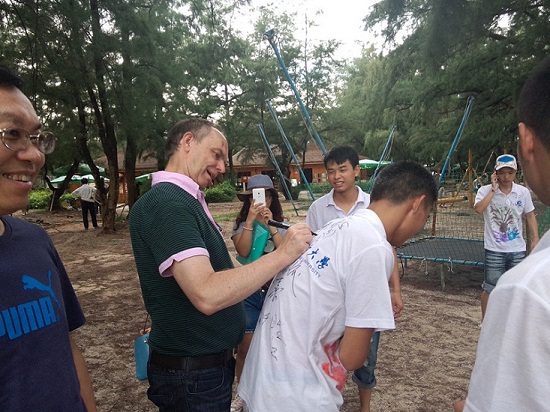 外國友人表示愿意參加到保護(hù)紅樹林的行動(dòng)中來,在隊(duì)服上簽上自己的名字
