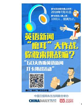 2018這個(gè)夏天,中國日報(bào)網(wǎng)攜手當(dāng)當(dāng)網(wǎng)推出首期“60天連聽英語新聞打卡達(dá)人活動(dòng)”,你不僅能通過中國日報(bào)網(wǎng)外籍專家的純正英音、美音了解每天世界上的精彩趣聞,還可以考驗(yàn)自己的毅力和自律性。60個(gè)工作日,三個(gè)月的時(shí)間,看似很短,但是你的努力,時(shí)間看得到!跟上我們這60天的步伐,相信您的英語能力會日益精進(jìn)。