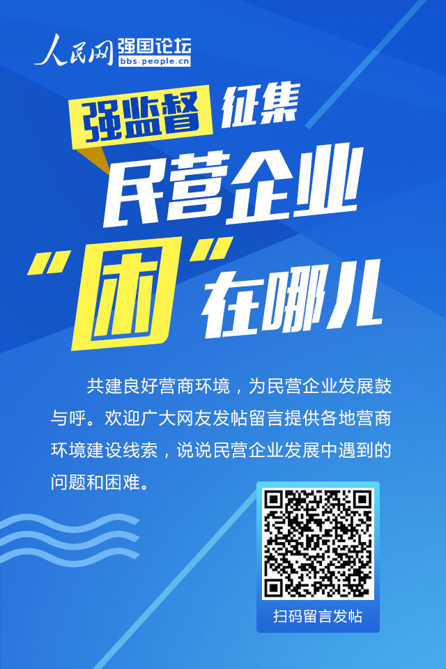 共建良好營商環(huán)境,為民營企業(yè)發(fā)展鼓與呼,人民網(wǎng)強國論壇開設“專項監(jiān)督”版塊,歡迎廣大網(wǎng)友發(fā)帖留言提供各地營商環(huán)境建設線索,說說民營企業(yè)發(fā)展中遇到的問題和困難,以期共同推動“糾正一些政府部門、大企業(yè)利用優(yōu)勢地位以大欺小、拖欠民營企業(yè)款項的行為”,為民營經濟發(fā)展創(chuàng)造健康環(huán)境。