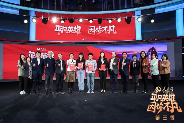 人民網(wǎng)黨委書(shū)記、董事長(zhǎng)、總裁葉蓁蓁與第三季“平凡英雄”合影