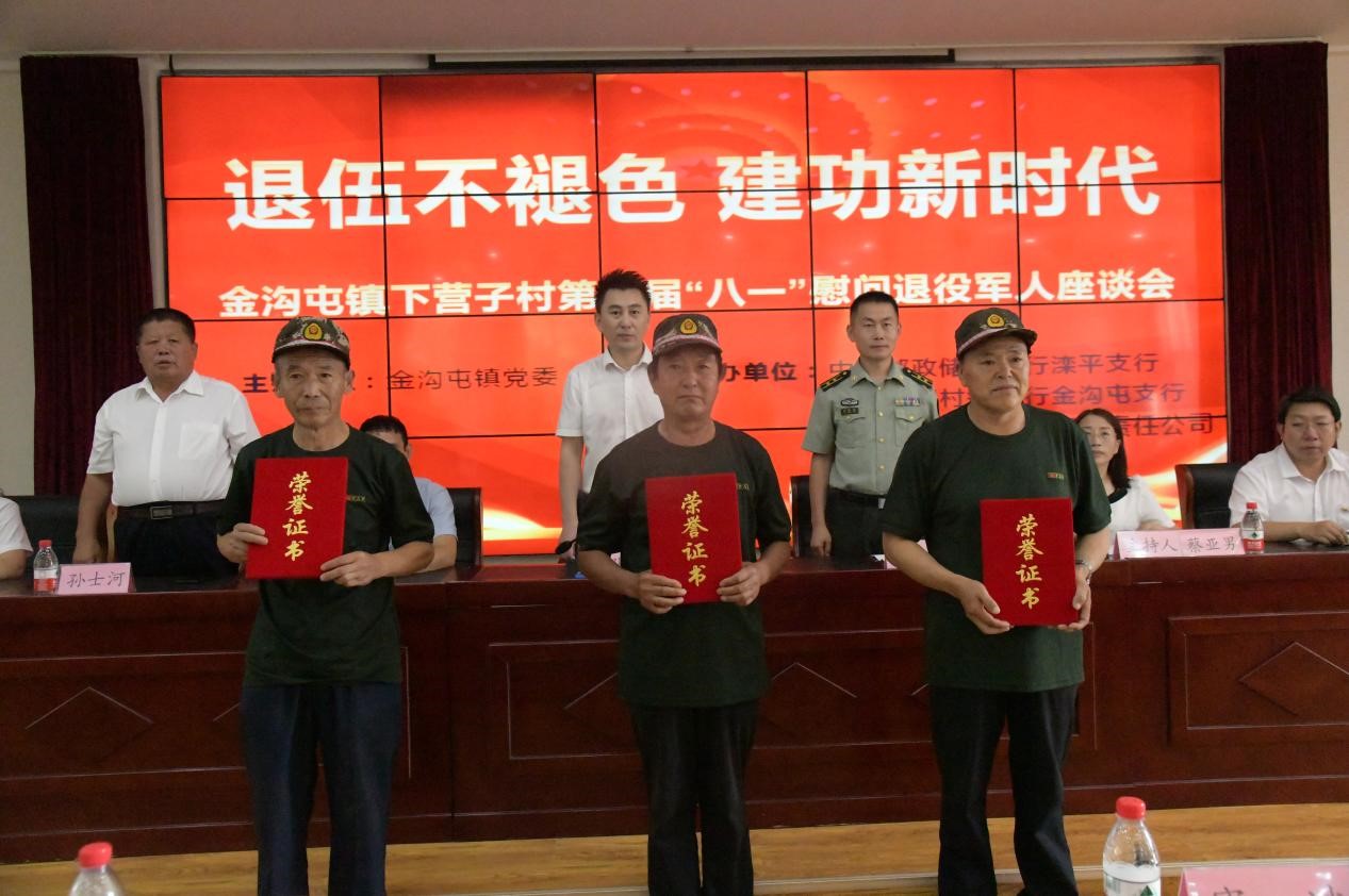 8月1日下午,灤平縣金溝屯鎮(zhèn)下?tīng)I(yíng)子村聯(lián)合愛(ài)心企業(yè)中國(guó)郵政儲(chǔ)蓄銀行灤平支行、灤平盛陽(yáng)村鎮(zhèn)銀行金溝屯支行和承德久財(cái)農(nóng)牧開(kāi)發(fā)有限責(zé)任公司共同舉辦了“退伍不褪色 建功新時(shí)代”第二屆“八一”慰問(wèn)退役軍人座談會(huì);顒(dòng)現(xiàn)場(chǎng),大家歡聚一堂,共同慶祝中國(guó)人民解放軍建軍95周年,共敘魚水深情,并為優(yōu)秀退役軍人頒發(fā)榮譽(yù)證書。 王海琦 郎朗 攝