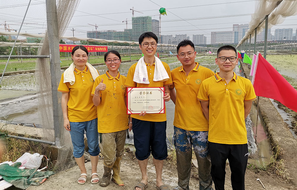 王克劍(中)帶隊(duì)參加中國水稻研究所組織的插秧比賽。受訪者供圖